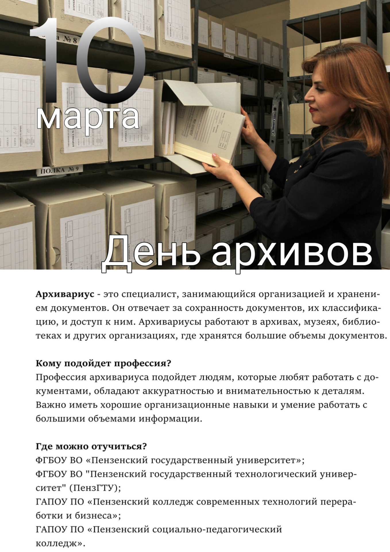 Сегодня мы отмечаем профессиональный праздник тех, кто бережно хранит и систематизирует документы, обеспечивая сохранность исторического наследия.